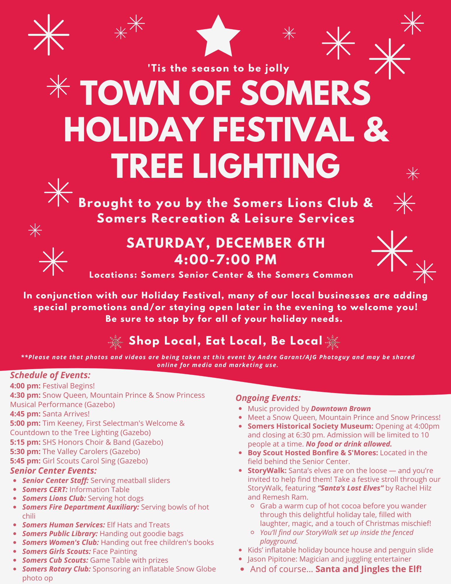 Santa will be visiting the Somers Public Library on Saturday, December 6. Online registration will begin on Saturday, November 22. Registration is required. Each program will feature the reading of a Christmas story, time to talk with Santa, a snack and a free book at the end of the program. Parents are invited to bring along their cameras and a non-perishable food item for Champ's Place. Sponsored by the Friends of the Somers Library.